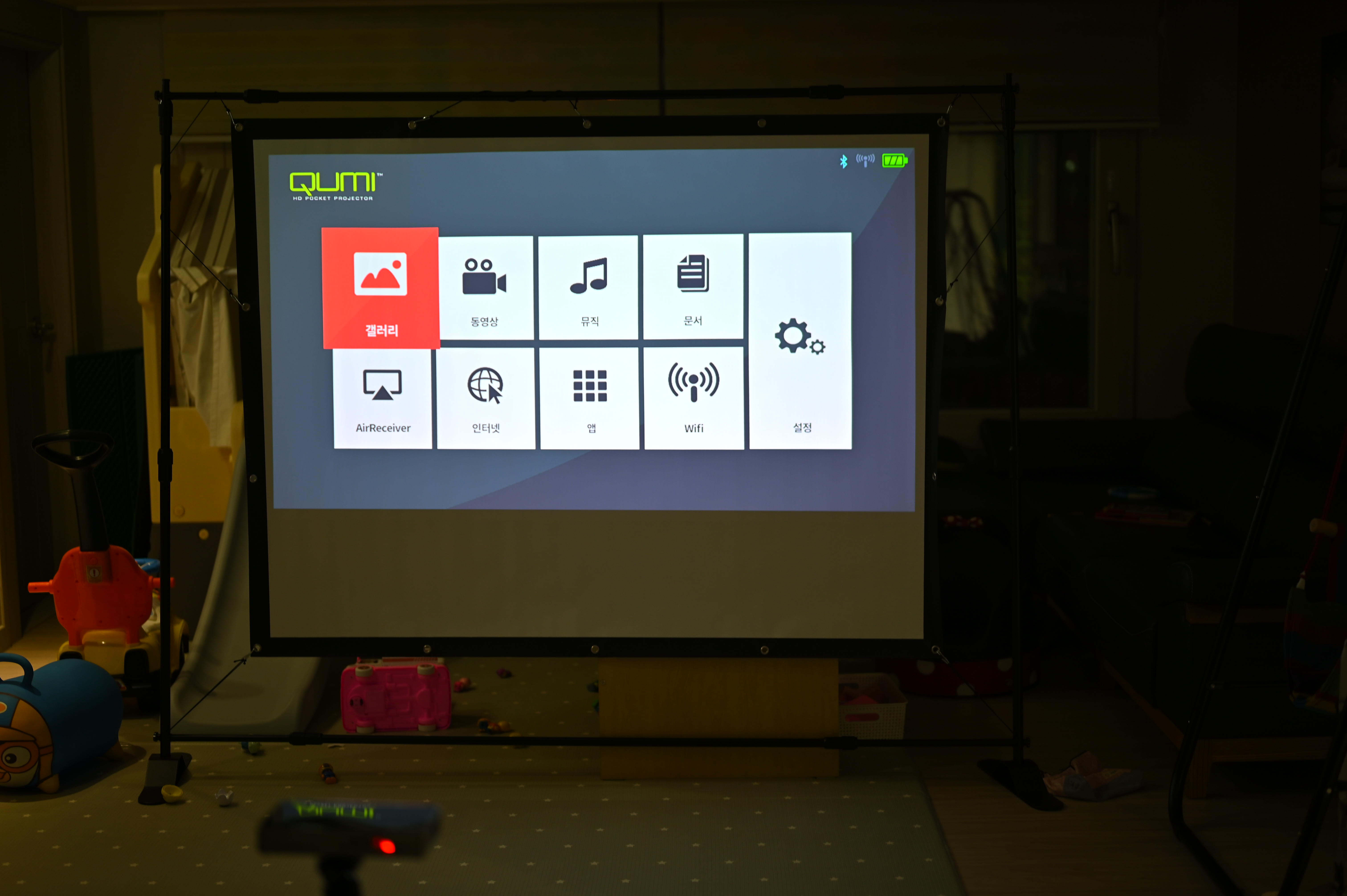 프로젝트 마니아에서 직접 구매했습니다. 사진을 찍어두지는 못했지만, 박스 개봉부터 기분이 너무 좋더군요. 잘 사용하지는 않겠지만, 볼펜 2자루 그리고 여유를 즐길 커피믹서 몇 개와 사탕, 캐러멜 그리고 손편지? 정말 오래전 카메라 중고 거래할 때 느낀 고마움이 진하게 느껴졌습니다. 스펙 및 화면 크기 밝기 등은 전문가가 아니라서 잘은 모르겠지만, 해진후 사용을 하다 보니 밝기는 너무 좋았습니다. 사실 기대하지 않았는데 정말 밝더군요. 단, 방에서 불을 켠 상태면 잘 보이지는 않습니다. 집이 LED 등을 사용해서 조금 밝은 편입니다. 전용 스크린을 캠핑장에서 사용하려고 구매한 것인데..(이것도 실수로 구매했어요.) 16:9가 아닌 4:3 스크린 80인치입니다. 빔과의 거리가 정확하게 몇 m인지는 모르겠지만..